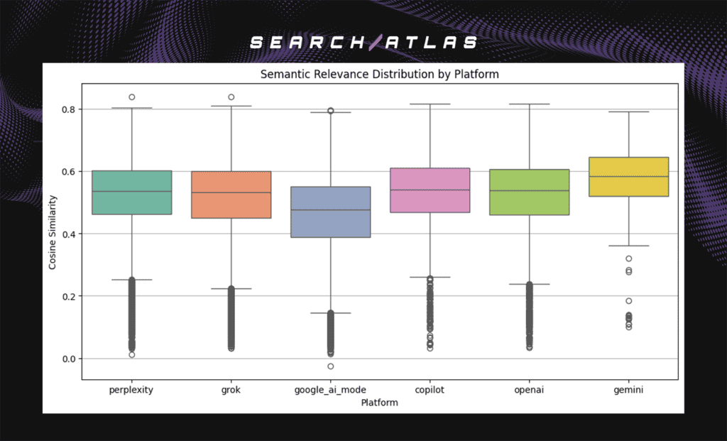 Below is a chart illustrating the distribution of semantic relevance scores across all platforms, highlighting differences in how consistently each LLM retrieves relevant content.