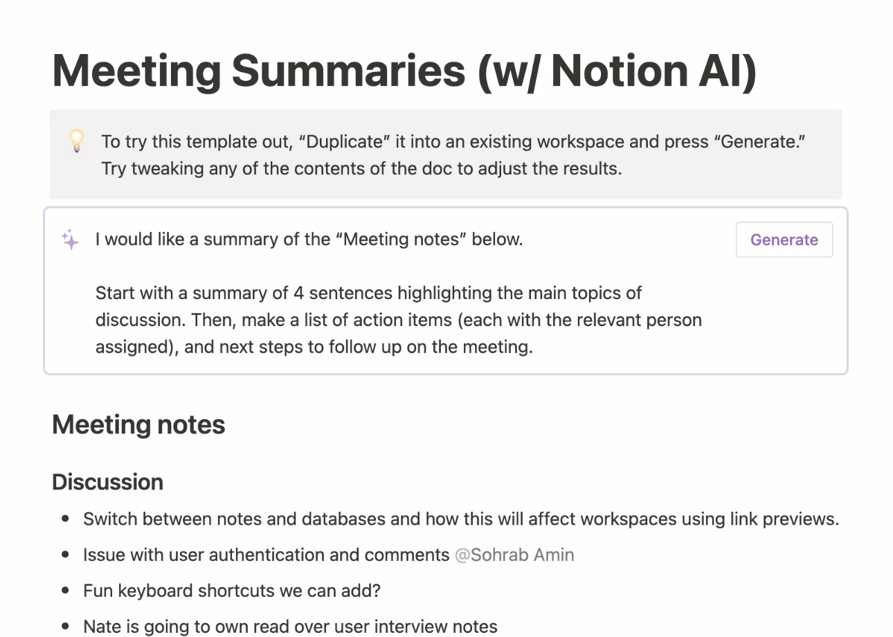 Core features include meeting transcription, AI-generated summaries with action items, and contextual drafting inside pages, databases, and templates. These capabilities transform conversations and raw notes into searchable documentation connected across projects. Built-in AI chat and workspace search extend rewriting beyond individual documents.