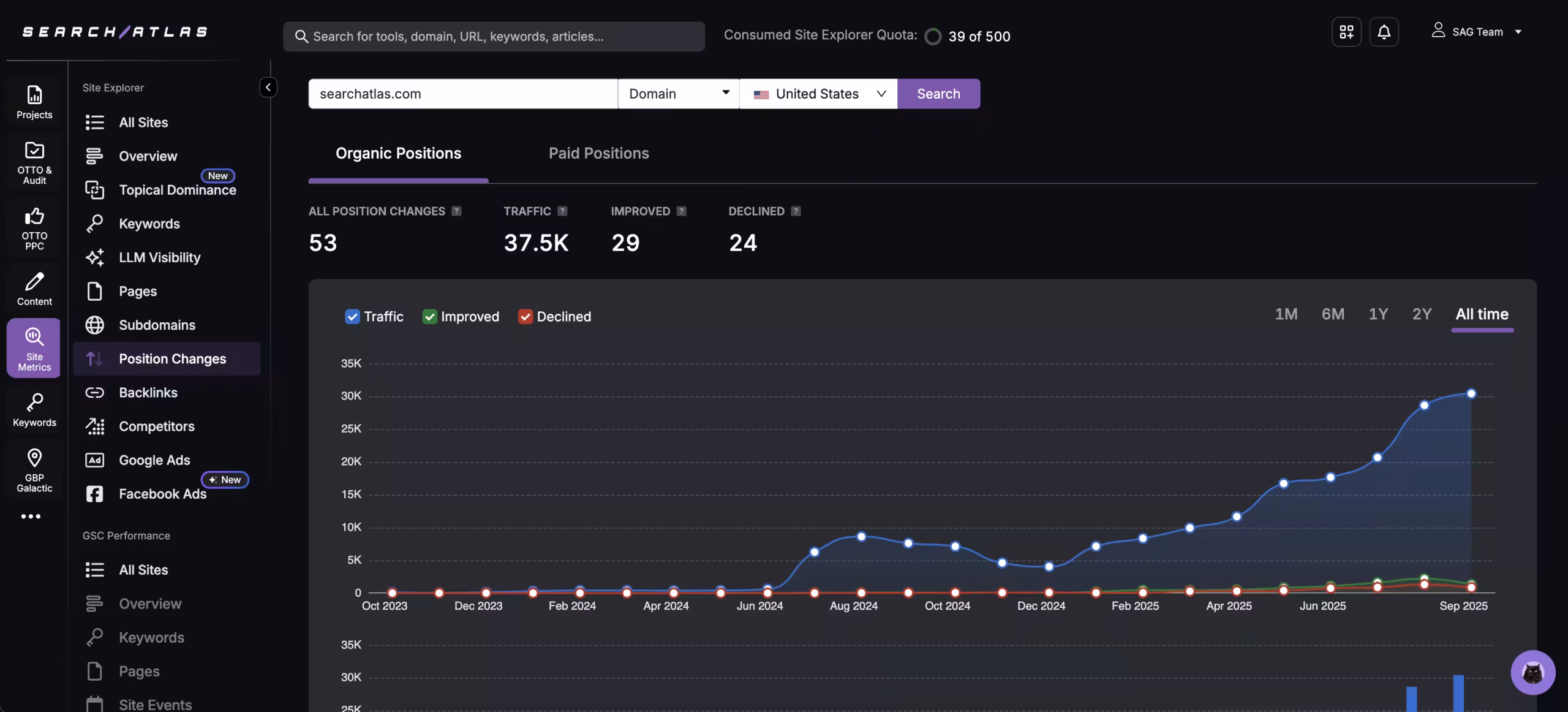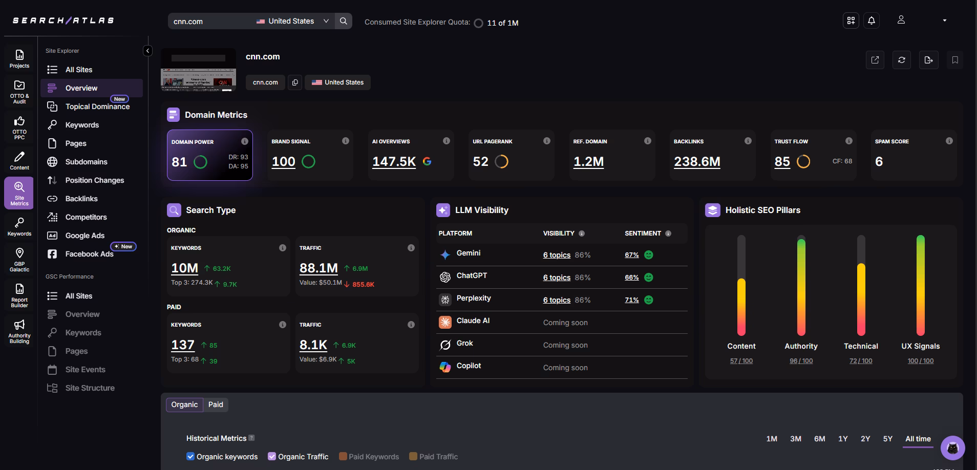 Site Explorer is the visibility intelligence system inside Search Atlas. It delivers a complete profile of how any domain performs in rankings, traffic, backlinks, brand demand, topical authority, and LLM visibility—all organized into actionable insights.